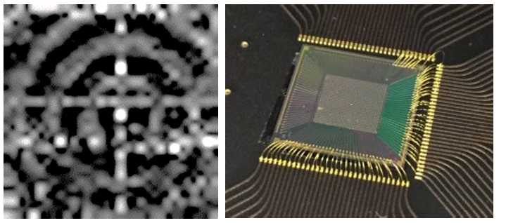 A close-up view of the chip (bottom-right) and an image of a circular pattern obtained with the prototype
